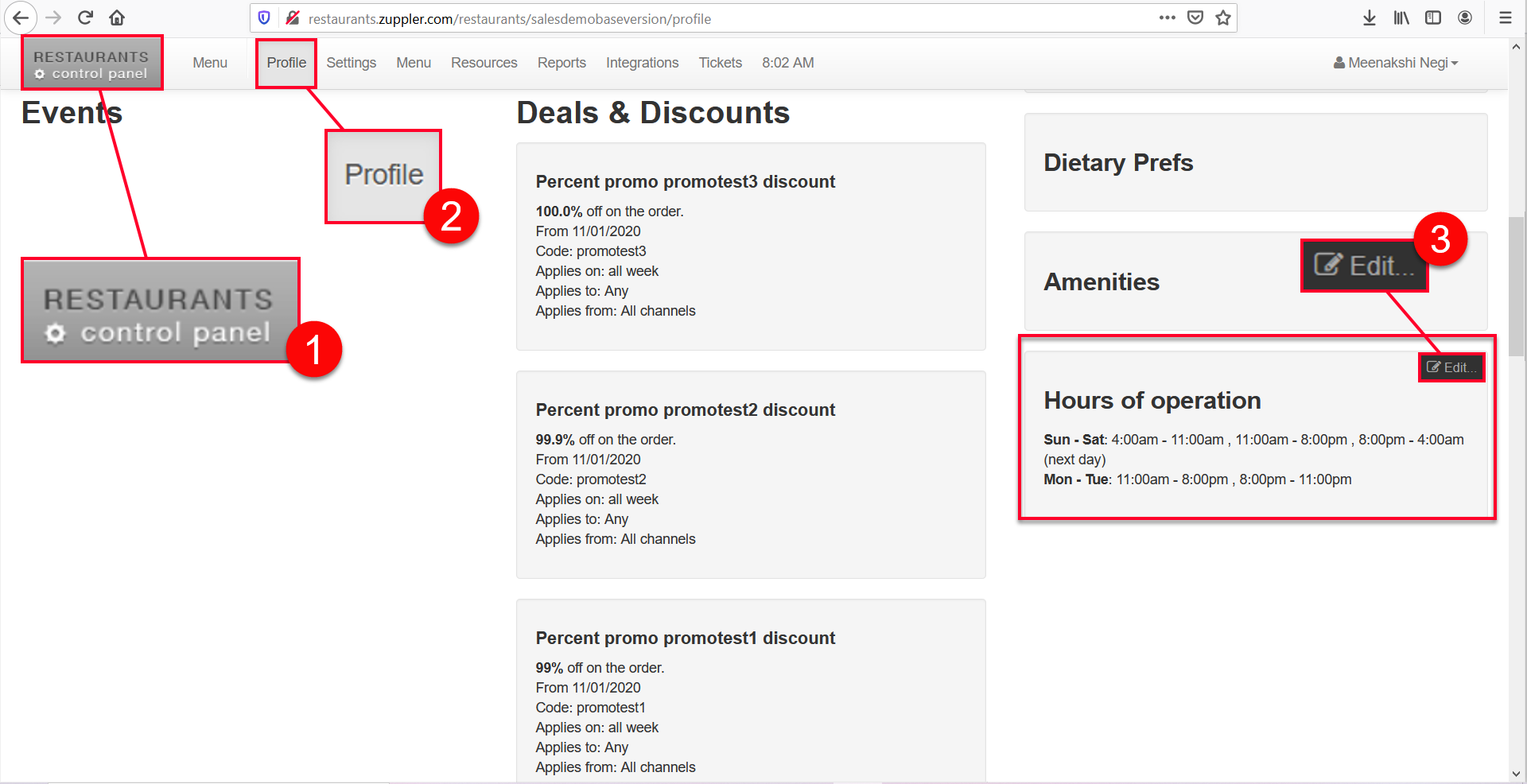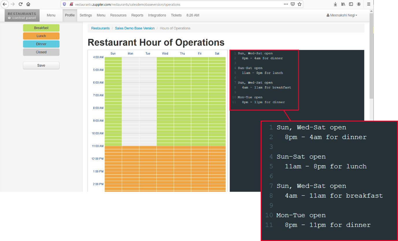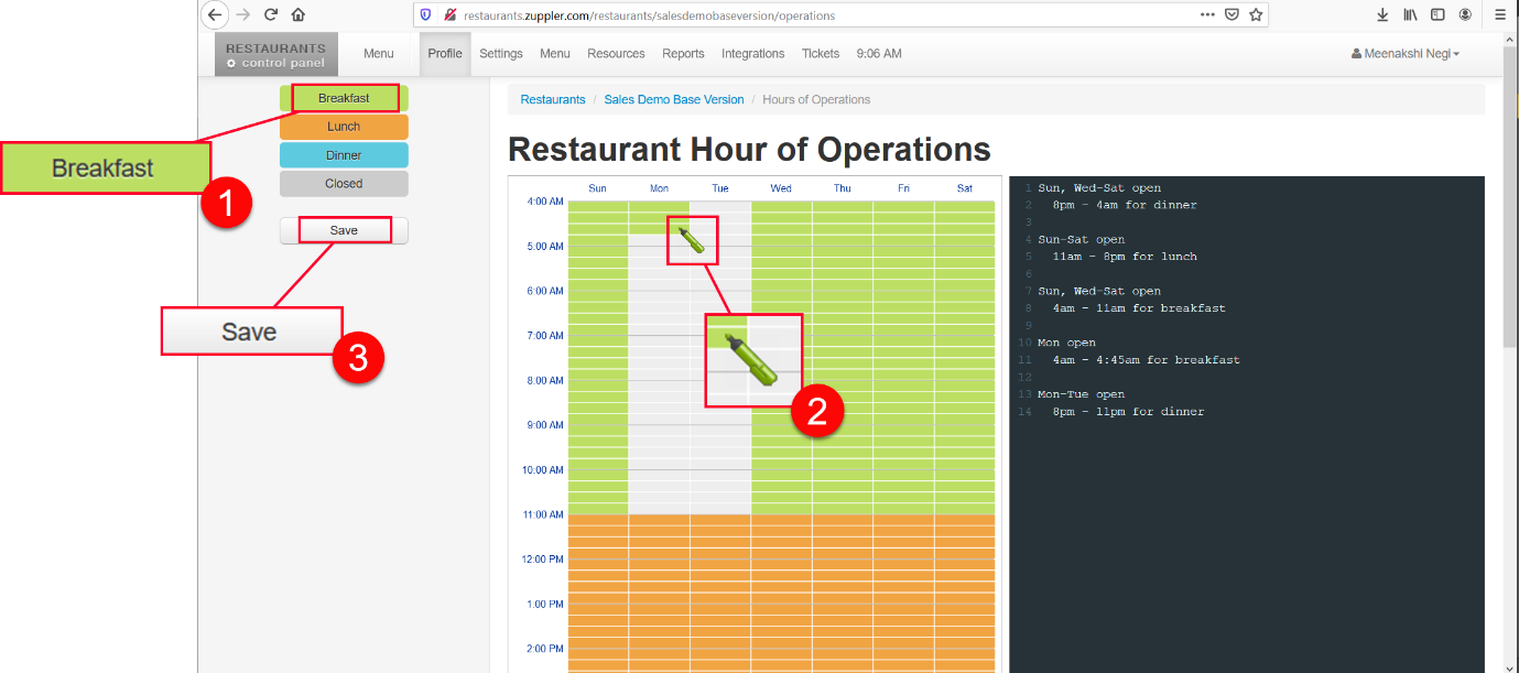 Take the following steps to open this Restaurant Hour of Operations panel: